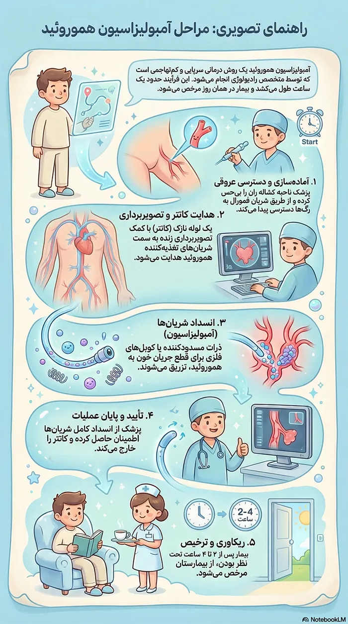 آمبولیزاسیون هموروئید یک روش درمانی مدرن و بسیار کم تهاجمی است که بدون نیاز به برش جراحی انجام می شود. در این روش پزشک متخصص رادیولوژی از طریق یک سوراخ کوچک در ناحیه کشاله ران وارد شریان فمورال می شود و با هدایت کاتتر به سمت شریان های رکتال فوقانی که وظیفه خون رسانی به بافت هموروئیدی را بر عهده دارند ذرات میکروسکوپی تزریق می کند. این ذرات جریان خون را مسدود می کنند و بافت هموروئیدی به تدریج کوچک می شود و علائم بیمار برطرف می گردد. این روش با نام تجاری Emborrhoid نیز شناخته می شود و به عنوان یک جایگزین موثر برای جراحی سنتی مورد استقبال جامعه پزشکی قرار گرفته است.